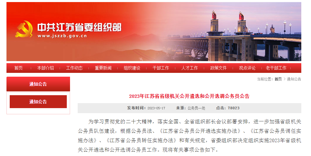 职位及资格条件等,详见《2023年江苏省省级机关公开遴选公务员职位表》和《2023年江苏省省级机关公开选调公务员职位表》,可通过中共江苏省委组织部网站首页“通知公告”栏目查询。
