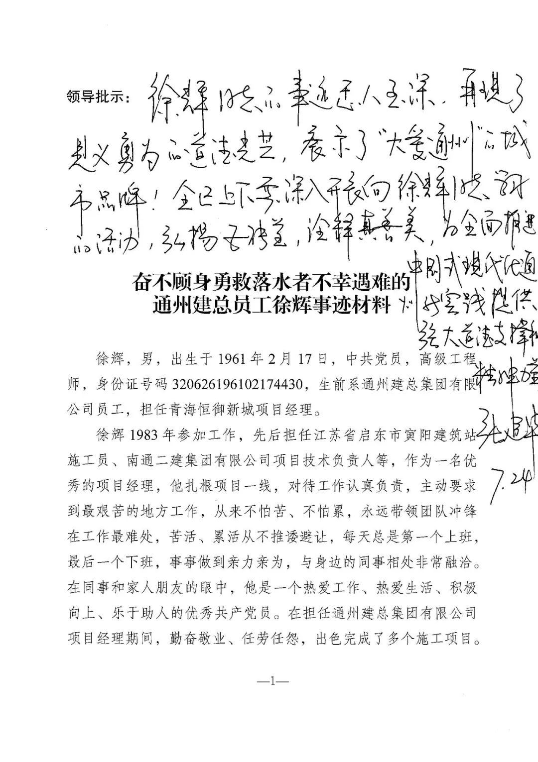 [南通新闻] 张建华就通州建总徐辉同志见义勇为事迹作出批示 |