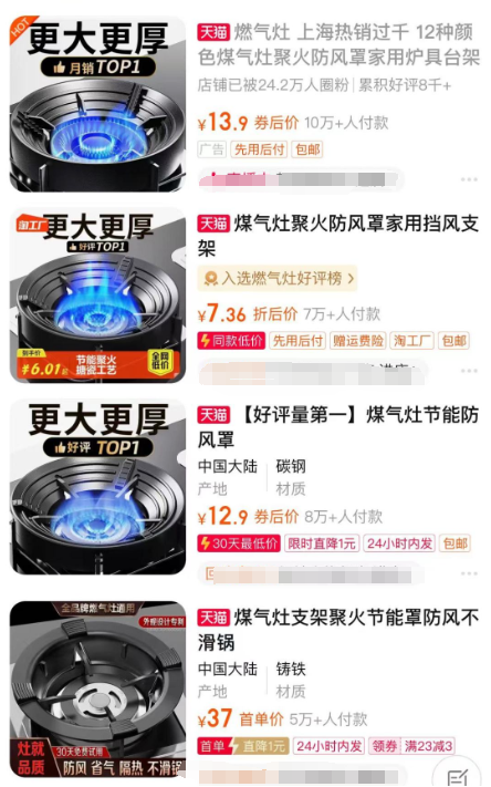 “聚拢火焰,节省燃气” “锯齿防滑,炒菜不滑锅” “搪瓷工艺,耐锈耐腐蚀” …… 看到这些广告宣传语 不少人激情下单这款"厨房神器" ——燃气聚能环 打开电商平台一看 价低且销量火爆