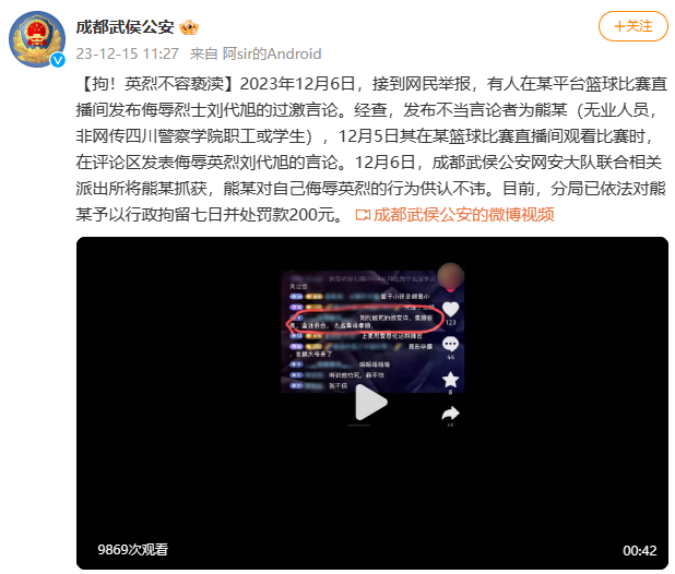 据@成都武侯公安 消息,12月6日,接到网民举报,有人在某平台篮球比赛直播间发布侮辱烈士刘代旭的过激言论。经查,发布不当言论者为熊某(无业人员,非网传四川警察学院职工或学生),12月5日其在某篮球比赛直播间观看比赛时,在评论区发表侮辱英烈刘代旭的言论。 12月6日,四川成都武侯公安网安大队联合相关派出所将熊某抓获,熊某对自己侮辱英烈的行为供认不讳。目前,分局已依法对熊某予以行政拘留七日并处罚款200元。  刘代旭,生前系四川省森林消防总队凉山州支队西昌大队三中队排长,四级指挥员消防救援衔。其在2019年3月31日凉山州木里县雅砻江镇立尔村发生的森林火灾抢险过程中,和30名队友葬生火海。