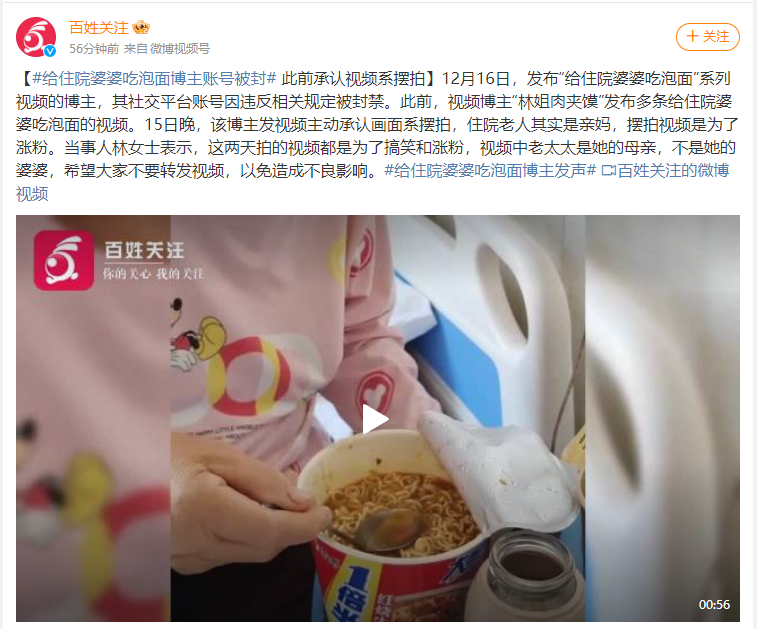 [新闻快讯] 女子摆拍“给住院婆婆吃泡面”,封! |