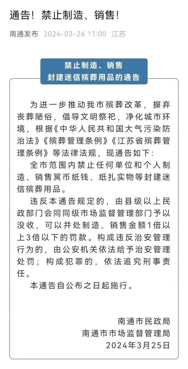 应读者要求,关于南通民政局、南通市场监管局联合发布的禁止任何单位和个人制造、销售冥币纸钱、纸扎实物等封建迷信殡葬用品这事,讲讲。 1.太过压迫的惩戒观感是这份禁令之所以饱受舆论抨击的核心要素。细读这份通告内容可以发现,这份通告规定按照通告目的、具体内容、违反后果三个段落层次展开信息叙述,其中针对“违反后果”的内容呈现比例接近50%,反而人们更为关心的具体内容却只有“全市范围内禁止任何单位和个人制造、销售冥币纸钱、纸扎实物等封建迷信殡葬用品”这么一句,并且通过“禁止制造、销售!”这样的标题及“禁止任何单位和个人”这类带有强烈压迫感的语态进行了特别强调,再加上后面一系列罚款、治安处罚、追究刑事责任等信息呈现,势必会大幅度增加人们对此前正常烧纸祭奠行为是否也要被追究法律责任的焦虑心理,进而产生了试图通过舆论质疑、舆论对抗这样引燃、引爆舆情的方式来倒逼政府“收回成命”的行为倾向。从这个角度上讲,无论是对于当下的南通,还是其他地方,都是一个需要及时总结的工作教训。在出台这类带有惩戒性质的公开通告时,不能仅仅以“禁止任何单位和个人”这样的强制指令官宣了之,还要对舆论更为关心的“具体什么行为才要被惩戒”等相应情节做好进一步的解释说明。比如什么是被允许的正常烧纸祭奠行为、什么才是需要被禁止的封建迷信行为,在“堵”与“疏”之间体现出足够的治理智慧。 2.关于这两天爆出来的上述“夸张烧纸行为”是否意味着舆论反转。我始终认为,舆论的判断从来不是非黑即白、非此即彼,不能因为网上出现了上面这样的夸张烧纸行为,就反过来去断定出台这样的规定一定合理合法,这是因为在依法治国的大框架下,出台任何规定都要基于充分上位法规则允许的大前提、大框架。以这个通告为例,其是否合理合法关键还是要看通告所列的《大气污染防治法》《殡葬管理条例》《江苏省殡葬管理条例》法律法规中是否给予了明确而清晰的前置依据。另外,我们知道殡葬牵涉世俗、民俗、民风等方方面面,且不说一个市,就好比一个镇里,不同的村、不同的乡,也可能存在不同的殡葬习俗,这些都要具体问题具体分析,加以充分的考虑,并不是出台这样“一纸禁令”就能立竿见影。因此,我不认为爆出这样几个夸张烧纸行为就认为舆论出现了反转,就断定这份通告的出台合理合规。