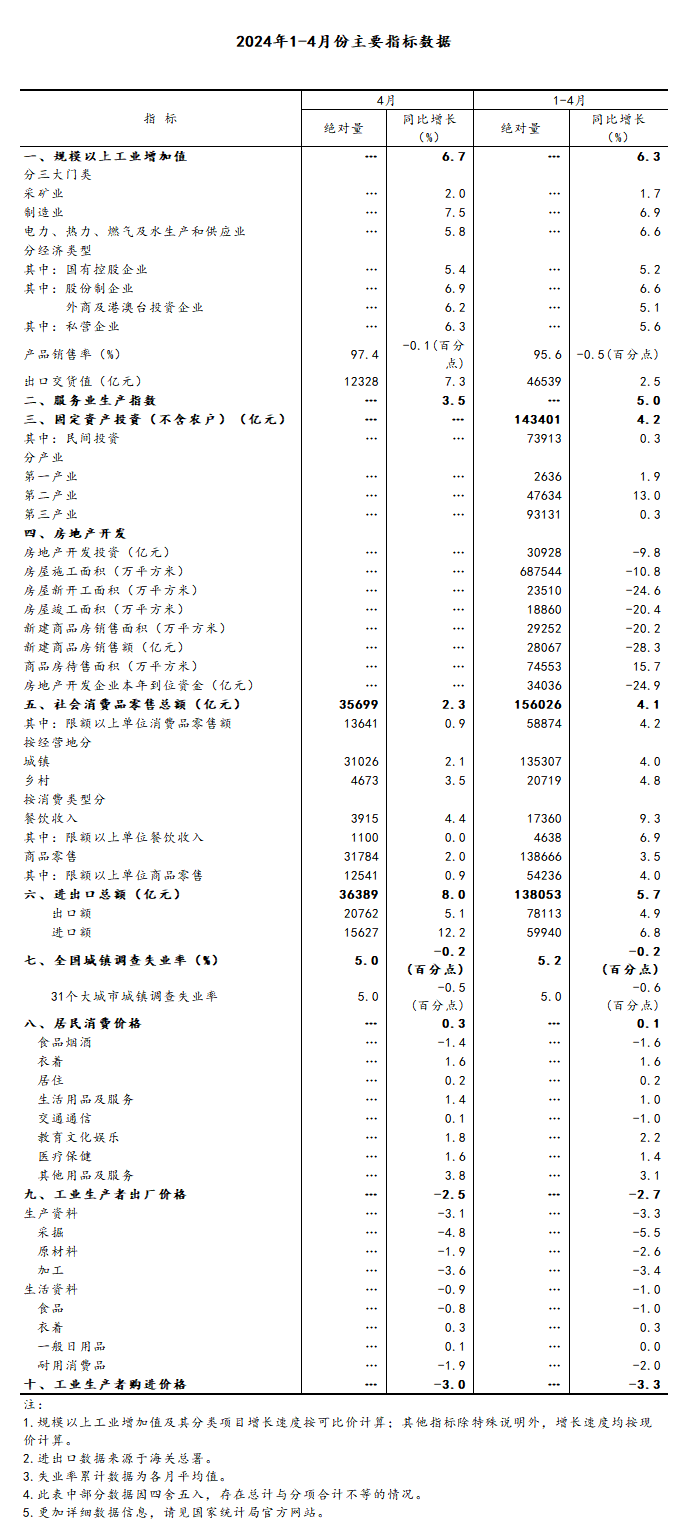4月份国民经济运行延续回升向好态势 (2024年5月17日) 国家统计局 4月份,各地区各部门认真贯彻落实党中央、国务院决策部署,坚持稳中求进工作总基调,完整、准确、全面贯彻新发展理念,加快构建新发展格局,扎实推动高质量发展,加大宏观政策实施力度,生产需求平稳增长,就业物价总体向好,社会预期持续改善,高质量发展扎实推进,国民经济运行总体稳定,延续回升向好态势。 一、工业生产加快,装备制造业和高技术制造业较快增长 4月份,全国规模以上工业增加值同比增长6.7%,比上月加快2.2个百分点;环比增长0.97%。分三大门类看,采矿业增加值同比增长2.0%,制造业增长7.5%,电力、热力、燃气及水生产和供应业增长5.8%。装备制造业增加值增长9.9%,比上月加快3.9个百分点;高技术制造业增加值增长11.3%,加快3.7个百分点。分经济类型看,国有控股企业增加值增长5.4%;股份制企业增长6.9%,外商及港澳台投资企业增长6.2%;私营企业增长6.3%。分产品看,3D打印设备、新能源汽车、集成电路产品产量同比分别增长55.0%、39.2%、31.9%。1-4月份,全国规模以上工业增加值同比增长6.3%,比1-3月份加快0.2个百分点。4月份,制造业采购经理指数为50.4%,企业生产经营活动预期指数为55.2%。1-3月份,全国规模以上工业企业实现利润总额15055亿元,同比增长4.3%。 二、服务业持续恢复,现代服务业发展较好 4月份,全国服务业生产指数同比增长3.5%。分行业看,信息传输、软件和信息技术服务业,租赁和商务服务业,金融业,交通运输、仓储和邮政业生产指数同比分别增长10.8%、6.1%、5.4%、4.3%,分别快于服务业生产指数7.3、2.6、1.9、0.8个百分点。1-4月份,全国服务业生产指数同比增长5.0%。1-3月份,规模以上服务业企业营业收入同比增长8.5%。4月份,服务业商务活动指数为50.3%;服务业业务活动预期指数为57.4%。其中,铁路运输、道路运输、邮政、电信广播电视及卫星传输服务等行业商务活动指数位于55.0%以上较高景气区间。 三、市场销售保持增长,服务消费增势良好 4月份,社会消费品零售总额35699亿元,同比增长2.3%;环比增长0.03%。按经营单位所在地分,城镇消费品零售额31026亿元,同比增长2.1%;乡村消费品零售额4673亿元,增长3.5%。按消费类型分,商品零售31784亿元,增长2.0%;餐饮收入3915亿元,增长4.4%。基本生活类和部分升级类商品销售增长较快,限额以上单位通讯器材类,体育、娱乐用品类,粮油、食品类,饮料类商品零售额分别增长13.3%、12.7%、8.5%和6.4%。1-4月份,社会消费品零售总额156026亿元,同比增长4.1%。全国网上零售额44110亿元,同比增长11.5%。其中,实物商品网上零售额37356亿元,增长11.1%,占社会消费品零售总额的比重为23.9%。1-4月份,服务零售额同比增长8.4%。 四、固定资产投资规模扩大,高技术产业投资增长较快 1-4月份,全国固定资产投资(不含农户)143401亿元,同比增长4.2%;扣除房地产开发投资,全国固定资产投资增长8.9%。分领域看,基础设施投资同比增长6.0%,制造业投资增长9.7%,房地产开发投资下降9.8%。全国新建商品房销售面积29252万平方米,同比下降20.2%;新建商品房销售额28067亿元,下降28.3%。分产业看,第一产业投资同比增长1.9%,第二产业投资增长13.0%,第三产业投资增长0.3%。民间投资增长0.3%;扣除房地产开发投资,民间投资增长7.2%。高技术产业投资同比增长11.1%,其中高技术制造业和高技术服务业投资分别增长9.7%、14.5%。高技术制造业中,航空、航天器及设备制造业,计算机及办公设备制造业投资分别增长49.6%、10.2%;高技术服务业中,电子商务服务业、信息服务业投资分别增长27.6%、19.9%。4月份,固定资产投资(不含农户)环比下降0.03%。 五、货物进出口较快增长,贸易结构继续优化 4月份,货物进出口总额36389亿元,同比增长8.0%。其中,出口20762亿元,增长5.1%;进口15627亿元,增长12.2%。进出口相抵,贸易顺差5135亿元。1-4月份,货物进出口总额138053亿元,增长5.7%。其中,出口78113亿元,增长4.9%;进口59940亿元,增长6.8%。1-4月份,一般贸易进出口增长5.3%,占进出口总额的比重为65.1%。民营企业进出口增长10.7%,占进出口总额的比重为54.6%,比上年同期提高2.5个百分点。机电产品出口增长6.9%,占出口总额的比重为59.2%。 六、就业形势总体稳定,城镇调查失业率下降 1-4月份,全国城镇调查失业率平均值为5.2%,比上年同期下降0.2个百分点。4月份,全国城镇调查失业率为5.0%,比上月和上年同月均下降0.2个百分点。本地户籍劳动力调查失业率为5.1%;外来户籍劳动力调查失业率为4.9%,其中外来农业户籍劳动力调查失业率为4.5%。31个大城市城镇调查失业率为5.0%。全国企业就业人员周平均工作时间为48.5小时。 七、居民消费价格同比涨幅稳中有升,工业生产者价格同比降幅收窄 4月份,全国居民消费价格(CPI)同比上涨0.3%,涨幅比上月扩大0.2个百分点;环比上涨0.1%,上月为下降1.0%。分类别看,食品烟酒价格同比下降1.4%,衣着价格上涨1.6%,居住价格上涨0.2%,生活用品及服务价格上涨1.4%,交通通信价格上涨0.1%,教育文化娱乐价格上涨1.8%,医疗保健价格上涨1.6%,其他用品及服务价格上涨3.8%。在食品烟酒价格中,鲜果价格下降9.7%,粮食价格上涨0.5%,鲜菜价格上涨1.3%,猪肉价格上涨1.4%。扣除食品和能源价格后的核心CPI同比上涨0.7%,涨幅比上月扩大0.1个百分点。1-4月份,全国居民消费价格同比上涨0.1%。 4月份,全国工业生产者出厂价格同比下降2.5%,降幅比上月收