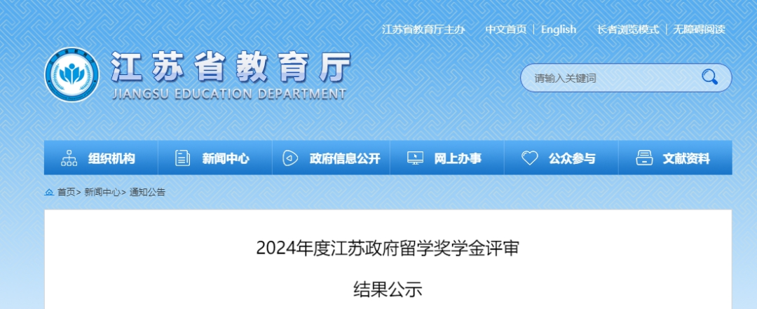 [新闻快讯] 2024年度江苏政府留学奖学金推荐人选名单,正在公示! |