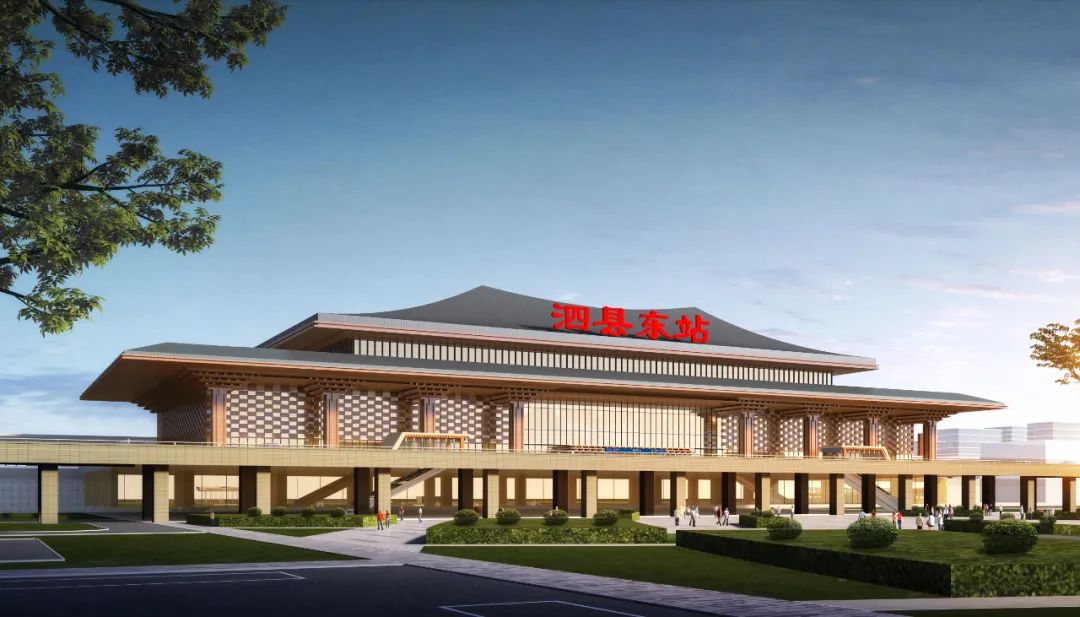 泗县东站位于宿州市泗县县城东南部,建筑面积11999.24平方米,站房最大高度为23.450米,最高聚集人数1000人,为线侧平式站房,站场两台四线,并设等长雨棚2座,8米宽旅客地道及12米宽天桥各1座。