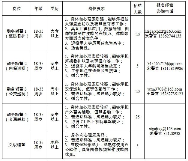 根据工作需要和有关规定,现面向社会公开招聘一批警务辅助人员(采取第三方劳务派遣用工方式,非人民警察身份、非行政事业编制)。现将有关事项公告如下:  1、拥护中华人民共和国宪法,拥护中国共产党领导和社会主义制度,遵守国家法律法规;2、中华人民共和国公民,户籍地、居住地均在南通地区;4、具有符合岗位要求的身体条件、心理素质和工作能力;5、同等条件下,优先招录烈士和因公牺牲人民警察的配偶和子女、退役军人、见义勇为人员;4、国家、省、市规定的不适合从事警务辅助工作的其他情形。(一)报名方式及时间:报考人员将以下材料扫描件打包压缩,邮件主题名及压缩文件名均以“姓名+报考岗位”命名,按照时限要求发送至指定邮箱。4、毕业证书(大专及以上学历,必须提供“中国高等教育学生信息网http://www.chsi.com.cn/xlcx”的《教育部学历证书电子注册备案表》和《毕业证书》电子照;如获得相应学位的,一并提供《学位证书》电子照);(二)资格审核:未按照要求报名或者提供材料不全的,视为初审不合格,不再另行通知。通过初审的报考人员由市公安局通知参加考试。 1、笔试:内容一般为公共基础理论知识、行政职业能力测试、应知应会法律知识等(勤务辅警笔试内容从简)。2、专业技能和体能测试:内容一般为与招录岗位职责任务相关的基本知识和技能(勤务辅警需参加体能测试)。3、面试:主要考察入职动机、语言表达能力、逻辑思维能力、仪表举止和情绪稳定性等。(四)体检:参照修订后的《公务员录用体检通用标准(试行)》执行,所有辅警岗位要求不得有纹身,交通辅助岗位不得有色盲色弱。(体检费用由报考人员自行承担)(五)考察:主要考察拟录用人员的思想品德、学习和工作表现、遵纪守法以及家庭背景等方面的情况,同时核实考察对象是否符合规定的报考资格条件,提供的报考材料是否真实准确。(六)签订合同:被录用人员与指定劳务派遣公司签订劳动合同,按照合同约定、岗位职责要求以及南通市公安局相关规章制度进行管理、使用和考核。试用期1-2个月,试用期考核不合格将依法解除劳动关系。被录用人员年度薪酬待遇按照市公安局相关规定执行,依法享受“五险一金”等待遇。招聘工作坚持“公开、平等、竞争、择优”的原则,全过程接受纪检监察和社会监督,一经发现并查实不符合本公告规定以及徇私舞弊、弄虚作假的,即取消录用资格。被录用人员自动放弃入职的,按总成绩从高分到低分一次性递补。招聘工作不设任何代办机构,笔试、专业技能测试、面试不指定教材,招聘过程中公安机关不收取任何费用。监督电话:市公安局机关纪委85020502。本公告由南通市公安局政治部负责解释。附件: 南通市公安局招聘警务辅助人员报名表.docx 南通市公安局 2024年9月25日 来源:南通公安
