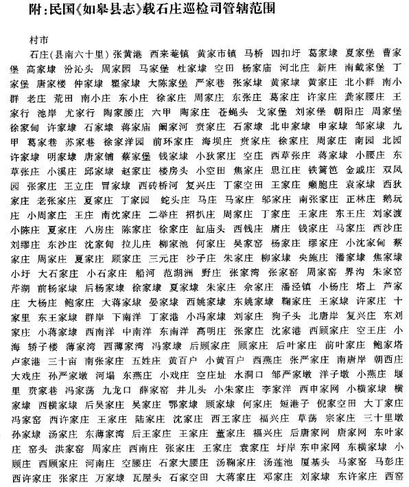 谈石庄的历史,绕不开石庄巡检司。 巡检司始于五代,盛于两宋,金及西夏也有类似设置。元因宋金遗制,所设巡检司主要为州县所属捕盗官,另有京师、沿海、蛮夷地区的较特殊形态,当时的巡检司除了无行政裁量权之外,也没有常设主官管,其功能性以军事为主。 明朝依其例沿用,不过佐以行政权力。晚清,中国人口大增,相对的县衙数量并无增多,于是次县级的巡检司在数量上与功能上日渐增多,成为基层的重要管辖机构。 石庄巡检司于明洪武年二年(1369年)初设,一直延续到宣统二年(1910年)清廷裁撤巡检司为止,一共存在了541年。 据民国《如皋县志》载:石庄巡检司图境计村市434处,即西至西来菴,北至潘经,东至薛家窑,南至大江边。通过管辖范围,我们可以推测石庄巡检司在当时的行政体制中的重要性。