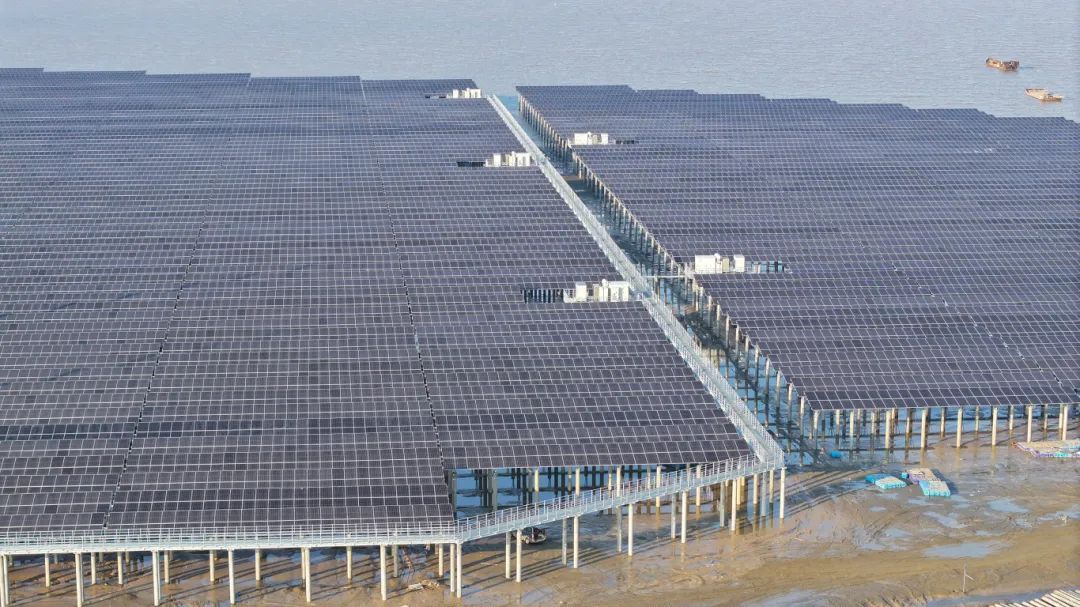 “光伏板安装完成后,具有遮阴效果,能有效阻碍互花米草进行光合作用,遏制这一外来入侵物种繁殖,同时板下空间还可以开展海洋渔业养殖、种植适宜滩涂生长的植物,进一步助力沿海生态环境改善。”项目经理裴泽伟介绍,该项目还充分利用沿海滩涂资源,采用先进的光伏技术和智能控制系统,实现高效的能量转换与储存,并结合氢能生产环节,通过电解水制氢的方式,进一步提升能源利用效率,整个项目的建成将会显著增强区域电网的调峰能力和供电稳定性,为地方经济发展注入强劲动力。