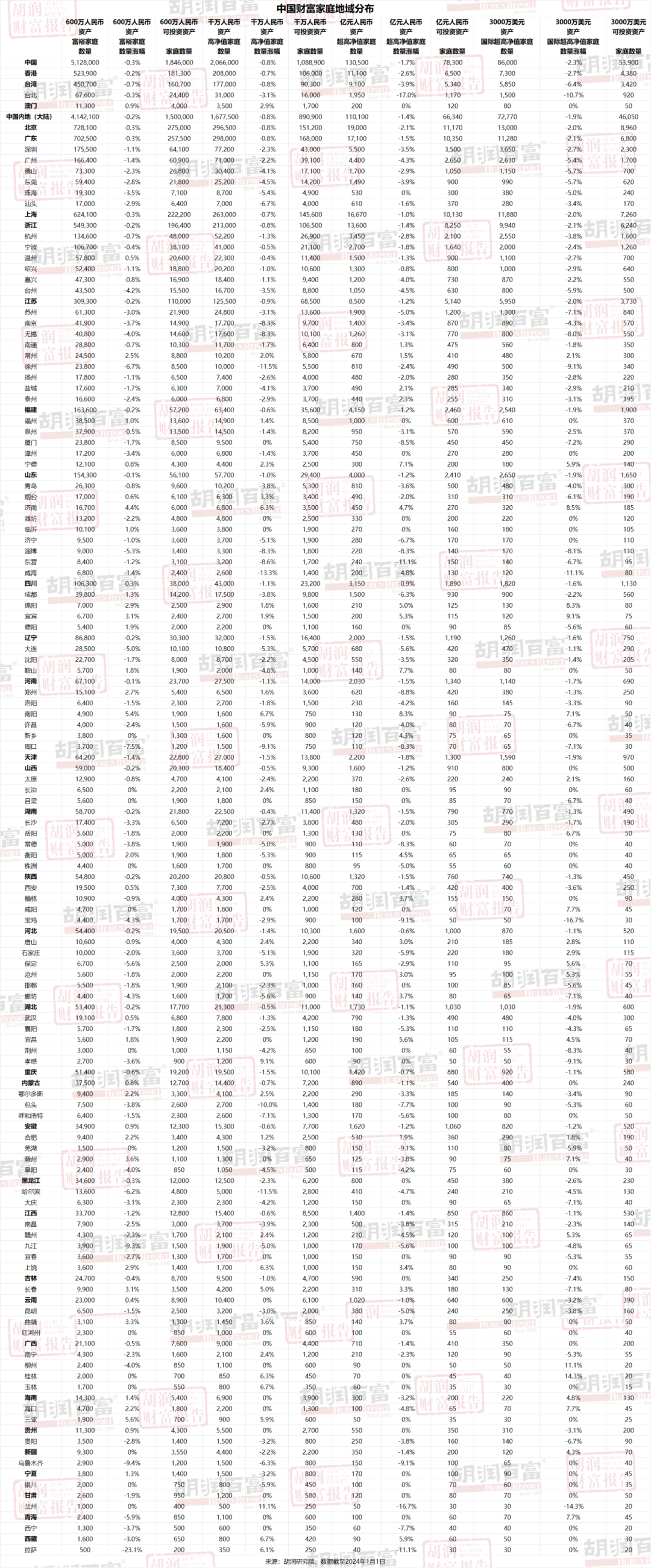 根据《报告》,中国600万资产富裕家庭数量微降至512.8万户,同比减少0.3%,减少了1.4万户。千万资产高净值家庭数量206.6万户,同比减少0.8%,减少了1.7万户。亿元资产超高净值家庭数量13万户,同比减少1.7%,减少了2200户。