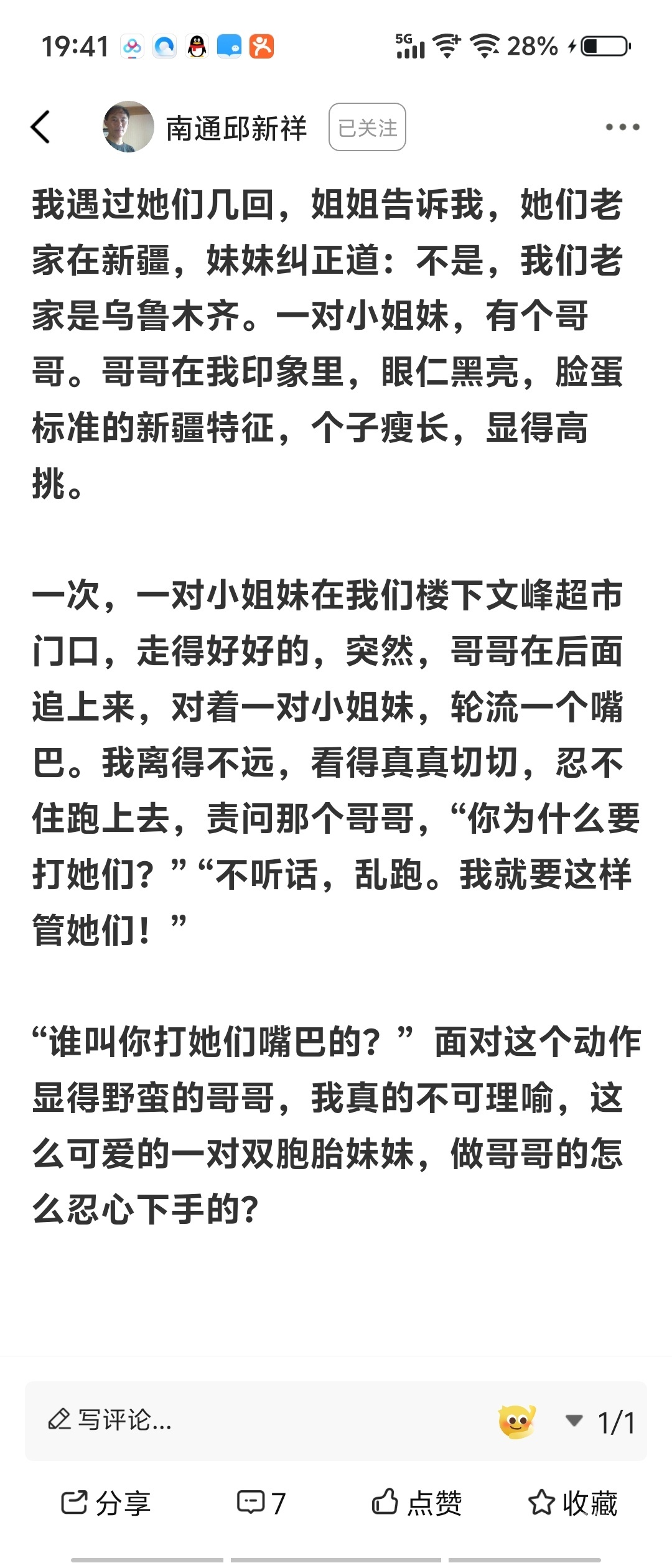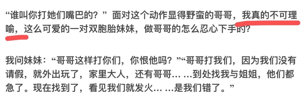 一次,一对小姐妹在我们楼下文峰超市门口,走得好好的,突然,哥哥在后面追上来,对着一对小姐妹,轮流一个嘴巴。我离得不远,看得真真切切,忍不住跑上去,责问那个哥哥,“你为什么要打她们?” “不听话,乱跑。我就要这样管她们!”