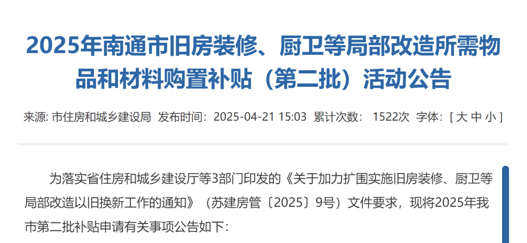 为落实省住房和城乡建设厅等3部门印发的《关于加力扩围实施旧房装修、厨卫等局部改造以旧换新工作的通知》(苏建房管〔2025〕9号)文件要求,现将2025年我市第二批补贴申请有关事项公告如下: