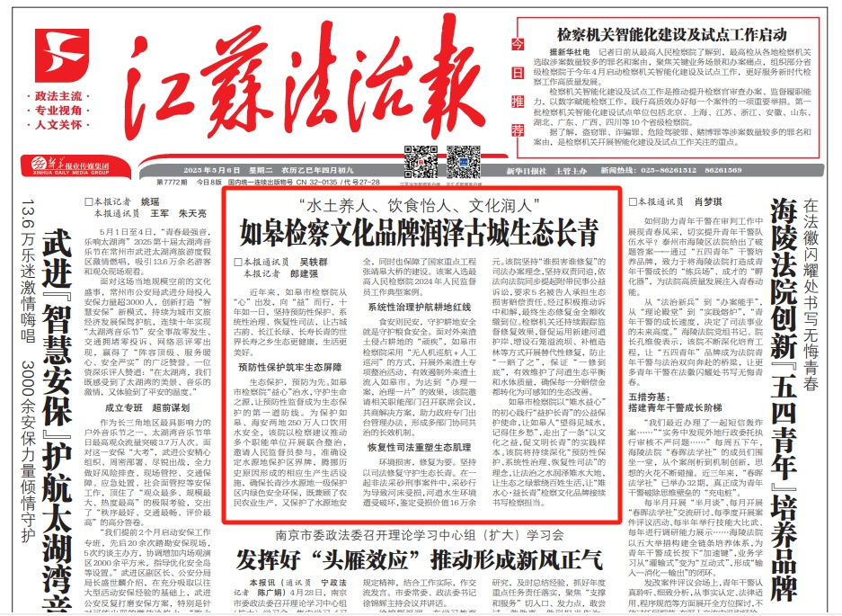 本文刊登于5月6日《江苏法治报》头版 近年来,如皋市检察院从“心”出发,向“益”而行,十年如一日,坚持预防性保护、系统性治理、恢复性司法,让古城古韵、长江长绿、长寿长青的世界长寿之乡生态更健康,生活更美好。
