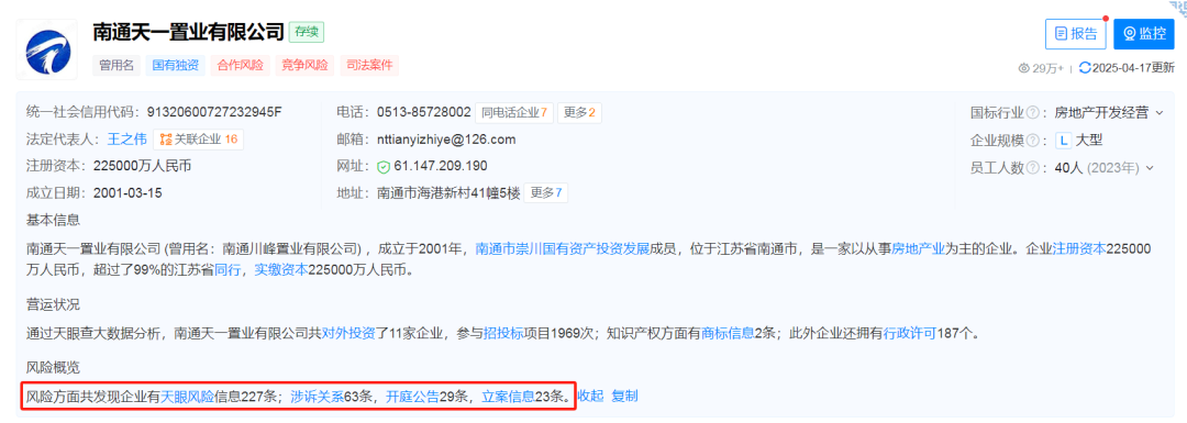 风险的阴影还蔓延至南通天一置业的子公司——南通天泰置业有限公司。作为天一置业全资控股的开发主体,天泰置业近两年在南通土拍市场也颇为活跃,然而其在天眼查上的风险信息同样不容小觑,目前存在风险信息131条;涉诉关系17条,开庭公告4条,立案信息6条。