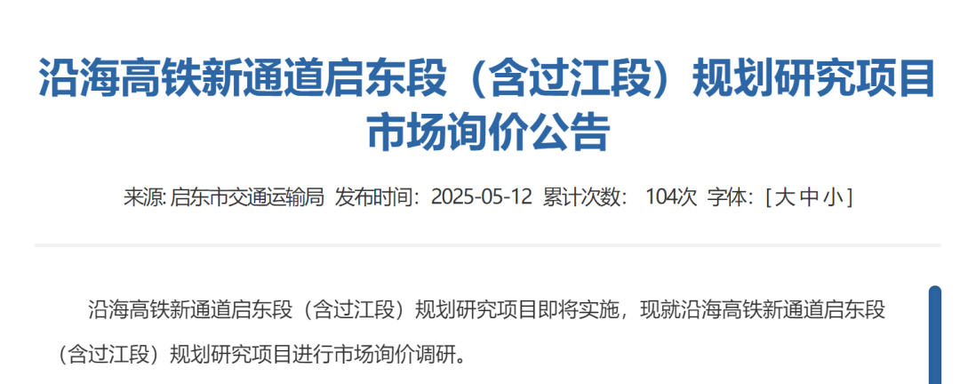 日前,启东市交通运输局发布《沿海高铁新通道启东段(含过江段)规划研究项目市场询价公告》,南通与上海筹划新增全新过江通道。