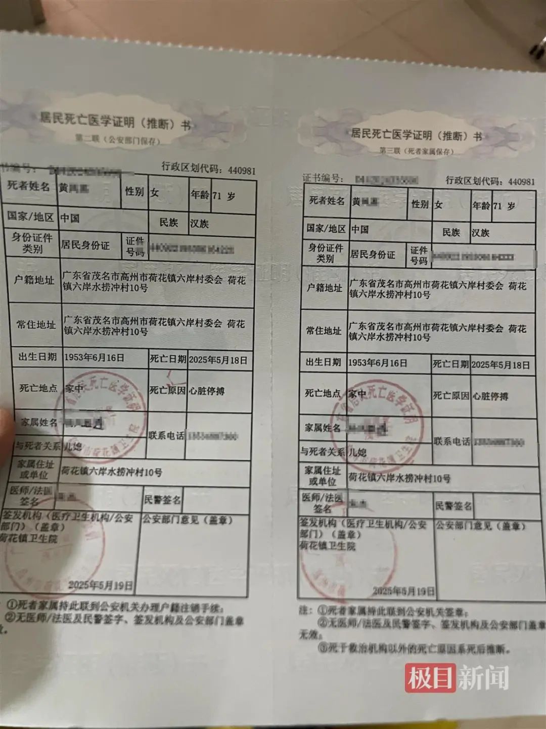 5月18日,广东茂名高州市荷花镇发生泥石流。23日,该镇水捞埇村村民古先生向极目新闻反映,其71岁的奶奶黄女士当天早晨被泥石流冲走遇难,然而事后拿到的死亡证明却称其系在家中心脏停搏,这让他们无法理解。