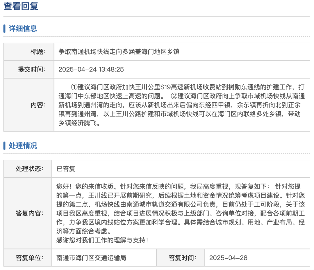 前几天,我在政府网站上看到一条留言,建议“争取南通机场快线走线多涵盖海门地区乡镇”。留言中提到,希望加快推进王川公路(三万线)从树勋到通锡高速南通新机场收费站的扩建工作,打通东片区域到新机场收费站的出行通道。同时,建议机场快线的走向能够覆盖更多东片乡镇,如四甲、正余等,方便居民出行,带动区域经济发展。政府对此作出回应,表示王川公路改造已启动前期研究,机场快线由南通轨道公司负责,目前处于工可阶段,后续将结合土地、资金等情况,综合考虑项目建设。 来源:南通市海门区人民政府官网 作为一位长期关注本地城市发展的普通市民,这条留言让我产生了不少思考。我并非海门东片区的居民,但平时开车经过那一带,尤其是从德胜往东走三万线时,确实能感受到那种“绕来绕去”的不便。特别是想到未来海门北站和南通新机场建成后,东片居民要前往这些重要枢纽,依然需要绕行三万线或绕远路,心里更觉得这件事不能再拖了。 三万线的现状与局限 三万线虽然是东片区域横贯东西的重要道路之一,但存在的问题确实不少。尤其是平山到树勋这一段,道路蜿蜒曲折,双向仅有两车道(单向一车道),路幅狭窄,弯道较多。沿线两侧的水杉树高大浓密,夜间照明条件差,行驶时常让人提心吊胆。此外,沿线居民区密集,电动车、行人随时可能穿行,道路安全隐患较大。一旦车流量增大,容易引发堵塞。 目前虽然三万线尚能勉强应对日常通行,但一旦未来海门北站建成投用,东片居民,尤其是树勋、万年、余东等地的居民,要前往北站或新机场,就必须依赖这条本就不宽的道路,或者选择绕行南下G345国道、北上S335等路段,无论怎么走都不够便捷。三万线受限于道路条件和周边环境,无法承担未来更多的人流、物流需求,也难以满足大型车辆通行的需要。要指望三万线支撑东片到北站、新机场的出行需求,实属不现实。 东通线西延,是破解东西片区出行难题的关键 我认为,解决东片交通问题,应当将东通线继续向西延伸。东通线作为双向四车道的快速路,标准高、通行能力强,是打通东西片区最合适的通道。如果东通线能够从树勋一路西延,直接接入德胜片区,并连通未来的海门北站和新机场收费站,就能真正实现东片居民与海门北站、机场之间的快速出行。这不仅是为了解决居民日常出行的问题,更是为了促进东片产业发展。 图片来源:百度地图 目前东片有不少企业,尤其是家纺产业,需要和叠石桥家纺产业集群进行对接,但由于路网不畅,运输成本高、效率低,制约了发展。如果东通线西延能够实现,将大大提升东片的物流能力,降低运输成本,吸引更多产业向东片布局,优化产业结构,增强区域竞争力。更重要的是,未来海门北站和南通新机场建成后,将成为整个区域的交通枢纽。东通线西延能够实现高速公路、快速路、铁路(北站、机场)之间的高效衔接,真正把东片居民、企业与整个枢纽经济圈连接起来,这对于促进区域一体化发展意义重大。 一点小小的期待 我理解,修路不是一件容易的事,涉及资金、土地、政策、规划等诸多复杂问题,推进需要时间。但作为一位普通市民,我仍然希望东片居民的出行难题能被更多人看到和关注,并逐步得到解决。看到政府已经启动了王川公路(三万线)的扩建前期研究,并同步推进机场快线的规划,这样的统筹思路值得肯定和支持。我希望未来相关部门在规划设计时,能更多地考虑东片居民的实际需求,把东通线西延工作做扎实,打通东片与西片、北站、机场之间的快速通道,让出行更便捷、物流更高效、区域联系更紧密。 希望海门的交通越来越好,希望我们的生活,能因为一条路的打通,变得更加方便、充满希望。