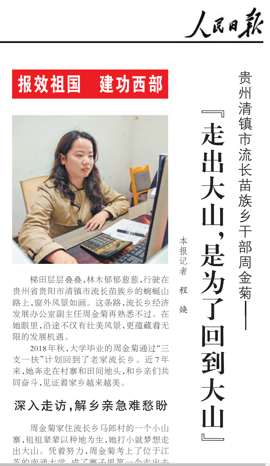 6月3日出版的人民日报在第六版看待“走出大山,是为了回到大山”的通讯,报道了南通大学政教师范专业2018届毕业生、贵州清镇市流长苗族乡干部周金菊扎根西部基层,带领乡亲们振兴乡村的故事。