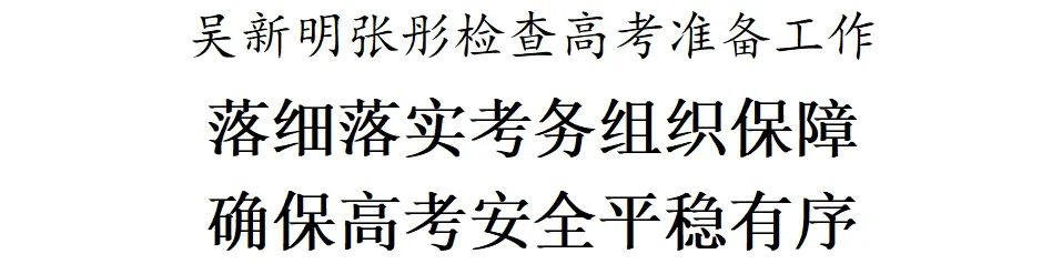 检查中,吴新明指出,高考关乎国家选才育才,牵动千家万户,社会广泛关注。要层层压实责任,细化各项任务,统筹做好考场及周边的交通管理、噪音隔断、隐患排查等工作,全力营造良好备考应考环境。要围绕高考全过程、各环节完善应急预案,优化服务保障,落实防暑降温、防雨防雷、医疗卫生、食宿安全等措施,关心关注考生心理健康,让广大考生安心备考、从容赴考、轻松应考。
