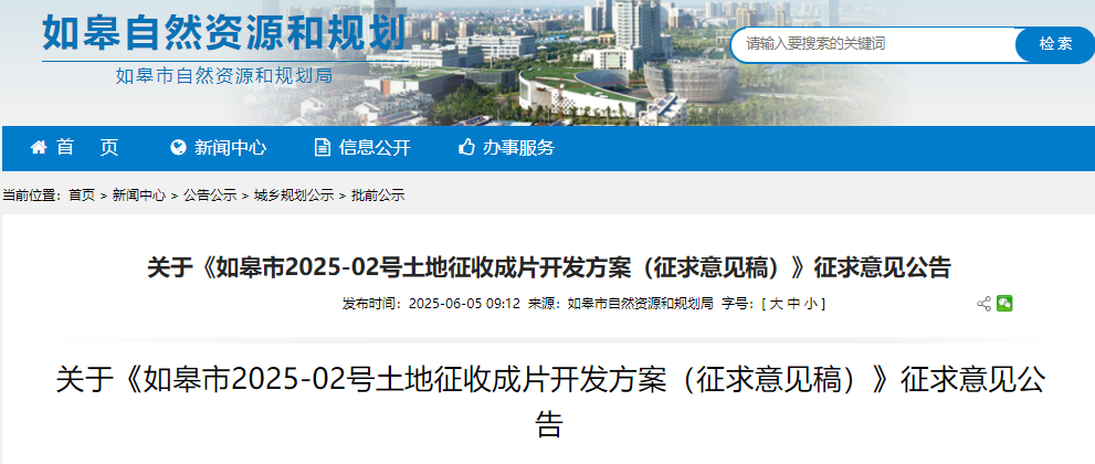 如皋自然资源和规划局发布关于《如皋市2025-02号土地征收成片开发方案(征求意见稿)》征求意见公告。本方案共涉及16个开发片区,涉及9个镇(街道),片区总面积239.5214公顷,其中10个片区为工业主导型、5个片区为产城融合型、1个片区为零星集体土地。