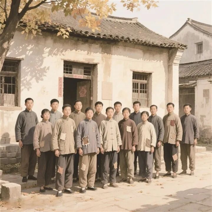 扎头巾的白,在泛黄的记忆里依然醒目,仿佛能嗅到当年仲秋的凉意。背景里,破损的窗棂沉默不语。他们或站或坐,衣扣都系得一丝不苟——粗布的旧衣裳,却比任何绫罗绸缎都更显庄严。