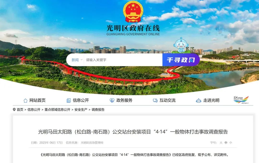 南都·湾财社记者注意到,6月17日,深圳市光明区政府在线公布《光明马田太阳路(松白路-南石路)公交站台安装项目“4·14”一般物体打击事故调查报告》。