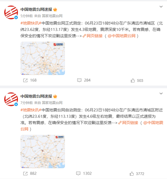 [新闻快讯] 广东清远发生4.3级地震,多地震感明显 |