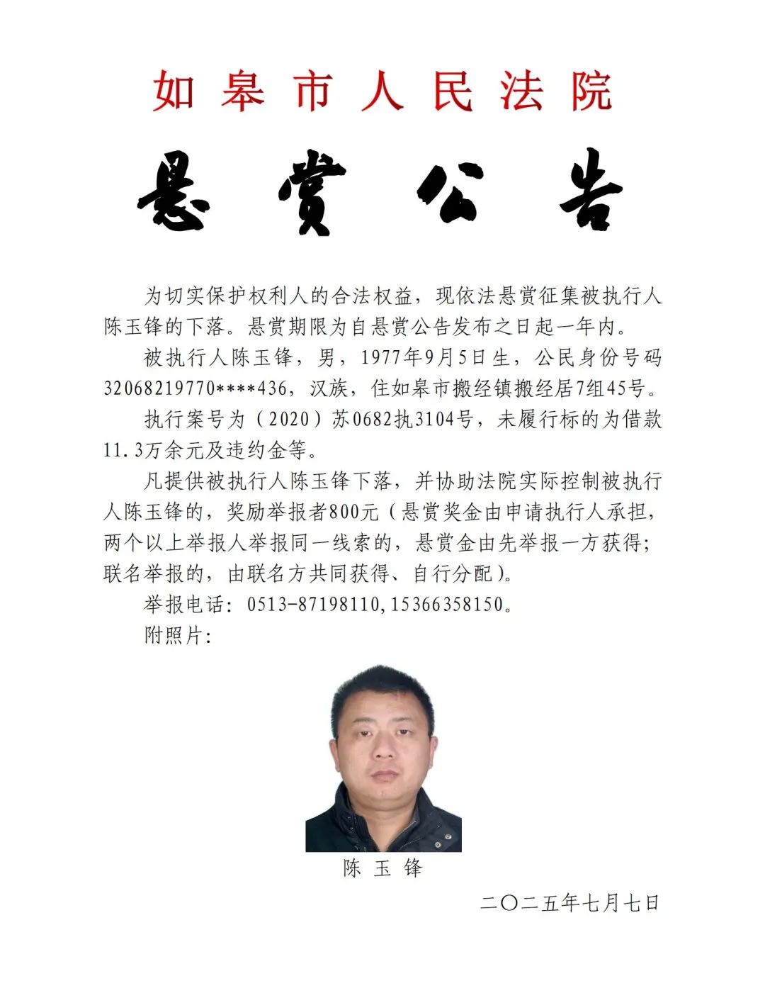 [新闻快讯] 如皋发布悬赏公告!涉及陈玉锋、陈菲、陈浩、戴凯…… |