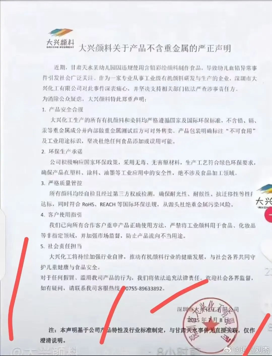 昨天(7月8日),甘肃省天水市联合调查组公布了当地幼儿血铅异常事件的调查结果。经公安机关侦查,褐石培心幼儿园园长、法定代表人朱某琳,投资人李某芳,同意该园后厨人员通过网络平台购买彩绘颜料,稀释后用于部分食品制作。 尽管昨天就有人质疑幼儿园的动机,为啥要买彩绘颜料添加到食品里,我们都还是选择相信了当地这份通报。 但是今天看到这份声明,有点坐不住了,没想到卖颜料发了声明。
