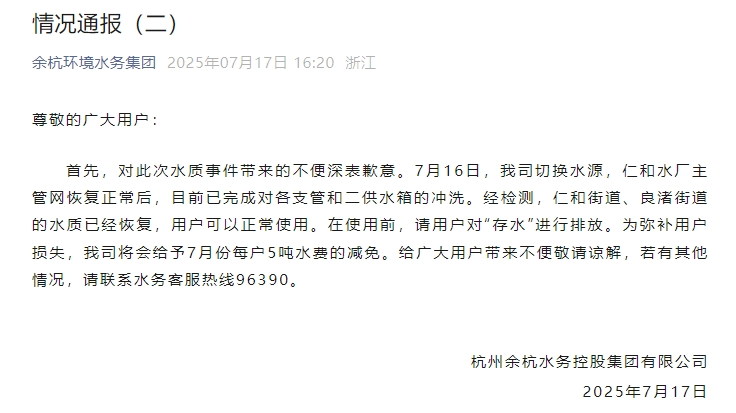 7月17日,杭州余杭水务控股集团有限公司再通报“余杭部分小区自来水发臭”: