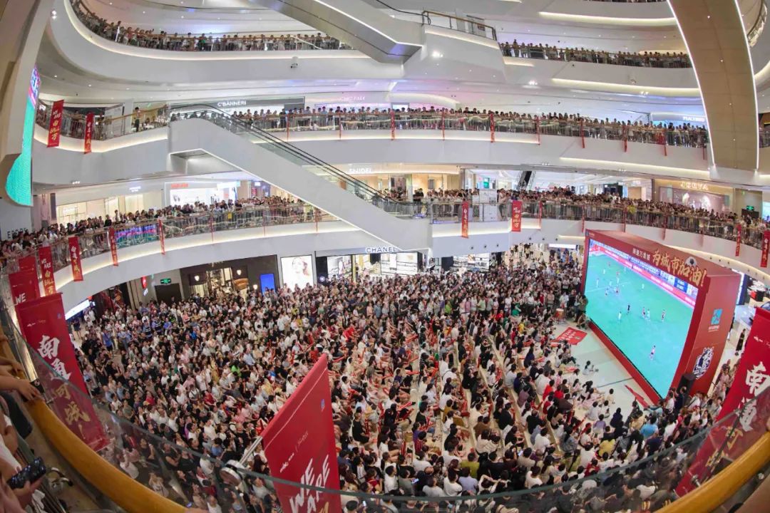 道旗、巨屏、标牌、海报……19日晚的万象城人头攒动,种种“苏超”元素吸引众多球迷驻足围观,进球刹那,欢呼声、呐喊声响彻中庭。现场巨幕五屏实时播放比赛战况,特邀啦啦队助阵,并设置抽奖、竞猜等环节增添互动体验,有效拉动人气。