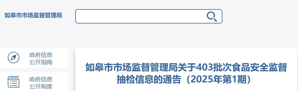 《如皋市市场监督管理局关于403批次 食品安全监督抽检信息的通告(2025年第1期)》
