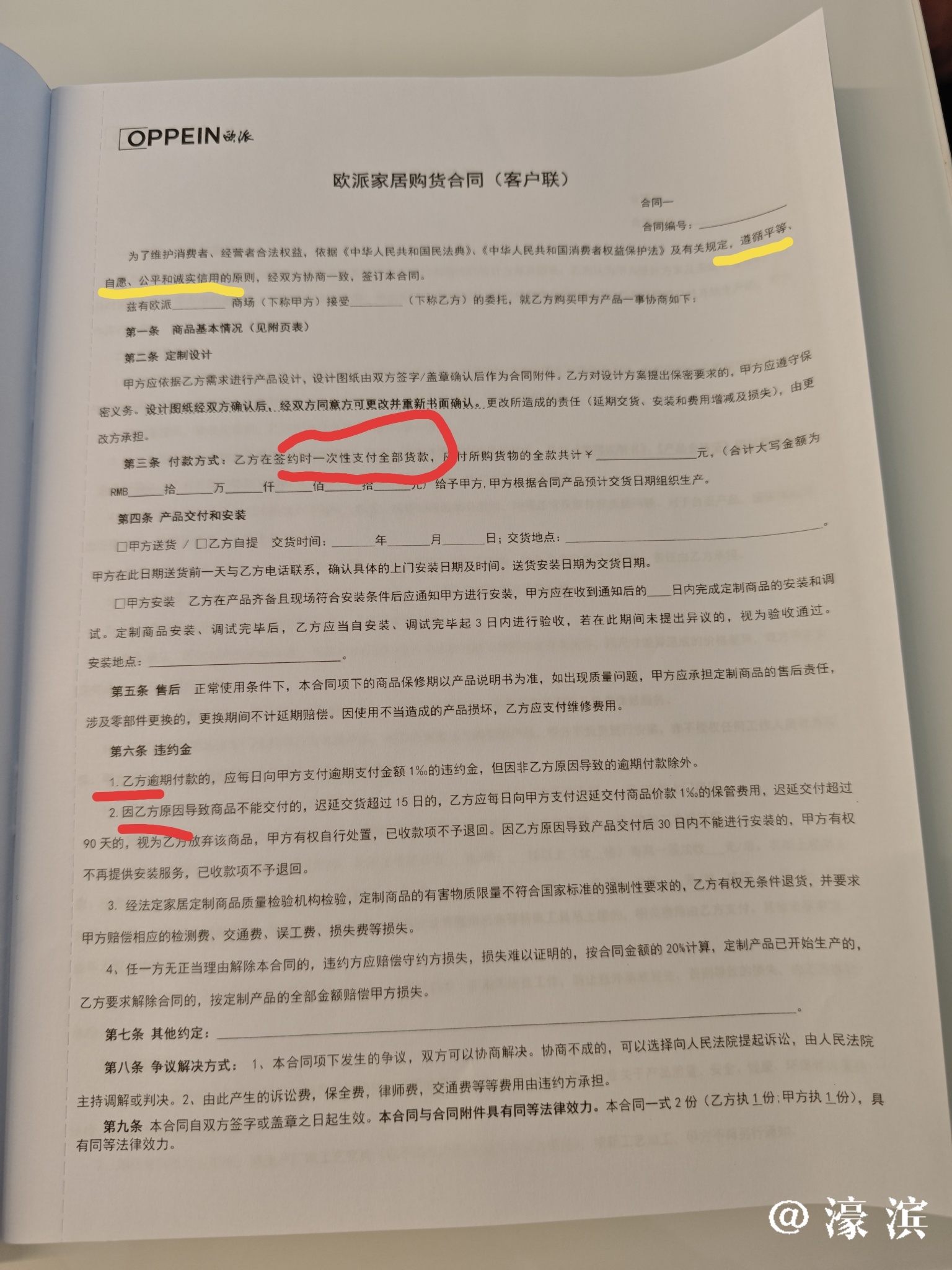 8月24日准备与欧派签订合同,欧派强制要求签订不平等条约,不接收协商,不签约前期支付5千元款不退回。