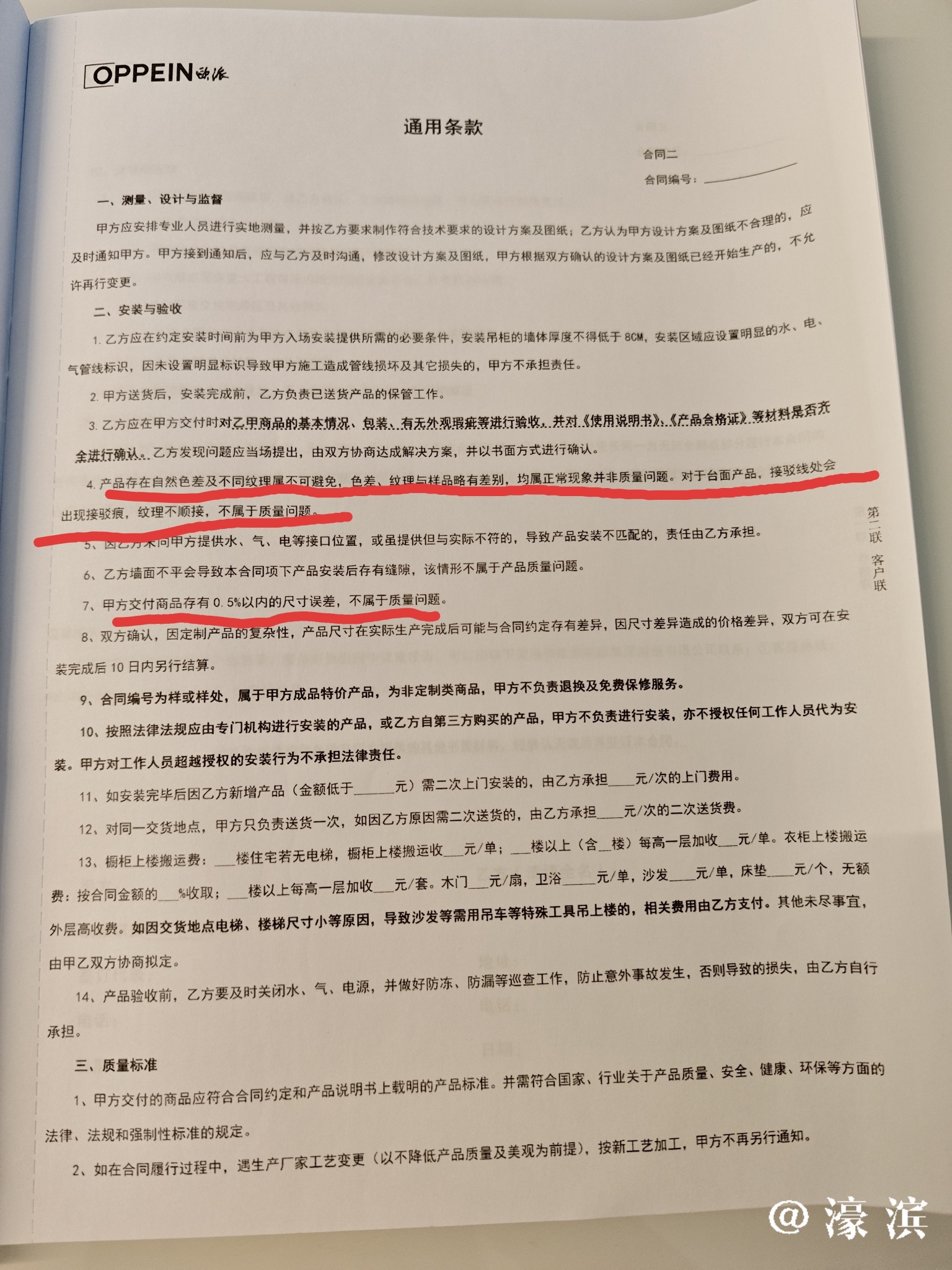 5 p3 S. j! b( P$ X* l! k- m3. 质量验收模糊:通用条款二“产品存在自然色差及不同纹理属不可避免…甲方交付商品存有0.5%以内的尺寸误差,不属于质量问题” ,其中“自然色差”“纹理差别”“0.5%尺寸误差”缺乏明确界定标准,易在验收时产生争议。+ _8 s7 d2 s' h3 O! `