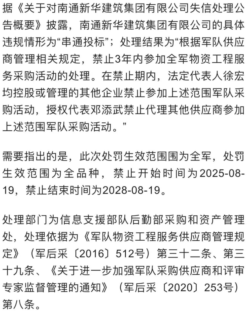 [新闻快讯] 串通投标,南通新华建筑集团有限公司被禁止3年内参加全军采购 |