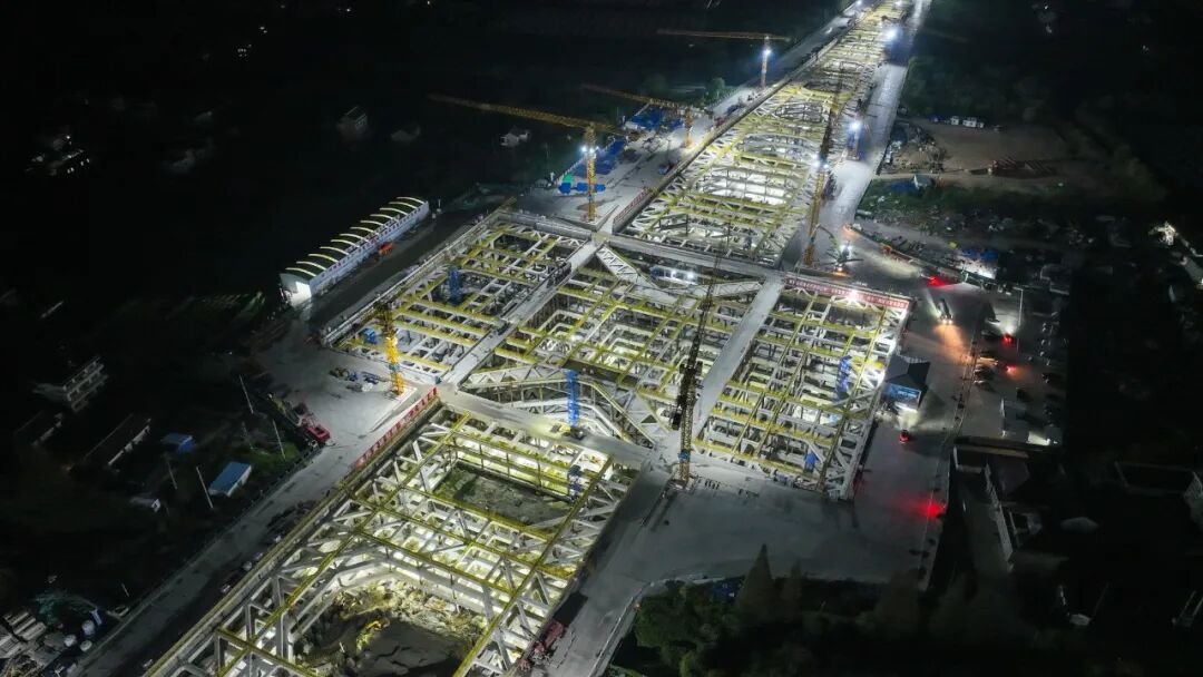 昨天深夜11时,海门地下29.4米深处,灯火如昼,机械轰鸣。经过27个小时的连续施工,沪渝蓉高铁沪宁段重点控制性工程——海门北站预留核心区首块底板顺利完成浇筑。这标志着我国目前最长的超深、超大基坑地下高铁站建设取得阶段性重大突破,全面转入主体结构施工阶段。 海门北站及两侧明挖隧道连续开挖长度达5.5公里,最大开挖深度29.4米,相当于向下掘进十层高楼。车站采用“两台六线”站场布局,地下一层为换乘通道,地下二层为高铁站台层,地下三层则预留地方城际轨道层。 13日清晨,记者沿着施工通道来到核心区施工现场,只见巨型基坑纵向延伸,一眼望不到尽头。 地面上,一辆辆混凝土搅拌车往来穿梭,源源不断地将混凝土输送至浇筑点;大型泵车伸出长臂,将混凝土精准注入基坑底层。基坑底部,首块底板浇筑正在进行,这里位于地下三层,是未来城际铁路换乘区域所在。工人们手持振动棒,在钢筋密林中细致作业,确保浇筑均匀密实……焊花闪烁、机器轰鸣、指挥声与混凝土倾泻声交织,现场热火朝天却又秩序井然。 中铁一局沪渝蓉高铁项目部海门北站技术主管曹艺锋告诉记者,本次浇筑混凝土总量约1000立方米,前后共计约100车次,技术负责人紧盯每一个环节,施工人员两班倒,实时调整浇筑速度与振捣频率,确保无冷缝、无瑕疵。 海门北站所处地层以富水粉土、粉砂和淤泥质粉质黏土为主,属于典型的“上松下软”不良地质,被工程师们称为“在豆腐块里修高铁”。曹艺锋说,在该类复杂地层中建造地下车站并通行时速350公里的跨站列车,属国际首例。面对挑战,项目建设管理单位沪杭客专公司与中铁一局项目部技术团队依托数字化智能管控手段,实施智慧降水、开挖与支护实时监测以及动态施工联防等措施,有效抑制围护结构变形,确保了工程安全与质量可控。