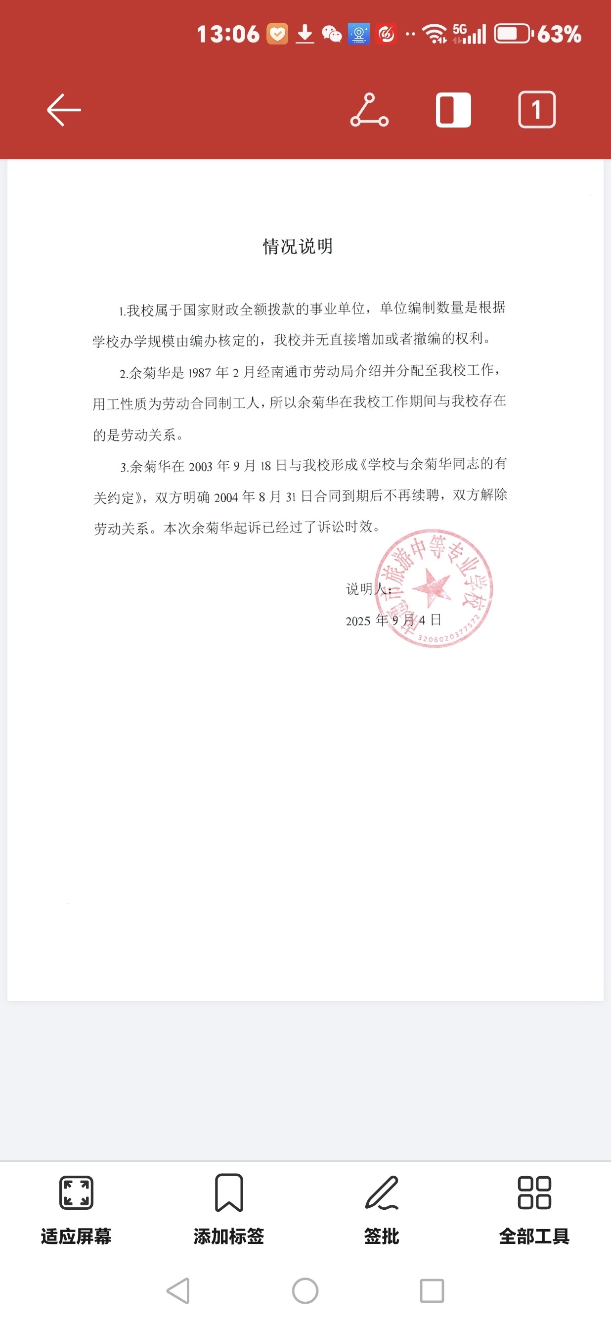 我来普及一下:从照片中可以看出余菊华是政府征地经过劳动局介绍安排到市教育局,然后市教育局把我6人先安排到各个学校,我呢被教育局安排来到旅中(原来的十七中),工资由财政全额拨款(2025年9月4日),旅中也认可了。再看下。9月1日法院审理我和学校人事关系是否合法解除一案,我很顺序从入职背景以及住校十几年到教育局统一统筹分房,我分得城南二村185-206室住房,然后搬出去了。就在2006年旅中给我开具退工,我在上面签字认可了,这事就过了对吧。很多人可能要问,既然认可了为什么还要为旅中是否合法解除人事关系打官司呢?听我慢慢道来:当然其实也很简单。就是我从入职开始,我的人事关系是《事业单位人事管理》体系下的,说明白点,就是学校没有用人权,在《事业单位人事管理》体系下的职工,解除或辞退必须严格遵循《法定程序和法定要件,二者缺一不可》这是法律强制性的规定。然而旅中在2006年4月10日不知谁给他这权利和胆量绕开主管部门教育局审批以及人事局审核。好了问题来了,退工单开了,又没有报主管部门教育局和人事局备案《见2025年8月28日》人社局出具官方证明,所以在9月1日庭审中,我恳请旅中在庭上回答问题:1.为何开具退工绕开主管部门教育局?2.我余菊华又符合那条法定条件被解除人事关系?3.解除我人事关系后我编制名额流向何处?前面告知旅中没有备案,事业单位人事关系变动必须要备案。4.我在职时几年扣发我财政拨款资金怎么处理的?面对4个问题,旅中在庭审中闭气,提出庭后书面提交法院。法官准许旅中三天内提供给法院(见情况说明)!好了,这个问题又来了,不打自招,没有权利处置编制人员,第二个,大家都见过不要脸的,更没有见过睁着眼睛说瞎话的旅中领导班子,当然一切还是依靠依据,请看图片我在7月30日告知孙勇校长我去中央巡视组,中央巡视组的人看到我入职材料登记说:你是事业编制人员,告知孙勇校长,孙勇校长也认可我是,呵呵,可要提交法院答复时无耻到了极点,不可理喻!孙勇校长就是当年全程参与者之一,现在是付校长以及纪委监委这一块的。不知道有幸的朋友看到这一幕:这样为人师表,这样的管理者有何感想!当然我只是把事情呈现出来,我只是说:做人要有底线,要学会做人,事情才会做好。犯了错不可怕,怕了就是错上加错,这样的人就是没得救。旅中这样的管理者不敢承认错误,还在作最后的挣扎,但事实无法改变(因为我有17个人同一批进入各个学校的,而我又没有法定的条件符合被解除人事关系),所以说:白的就是白的。叨扰了!