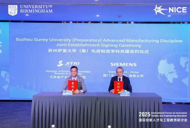 近日,长三角国家技术创新中心与伯明翰大学联合举办的“2025国际创新人才与工程教育研讨会”在上海开幕。开幕式上,多项围绕苏州萨里大学(筹)学科共建与合作培养的协议正式签署。