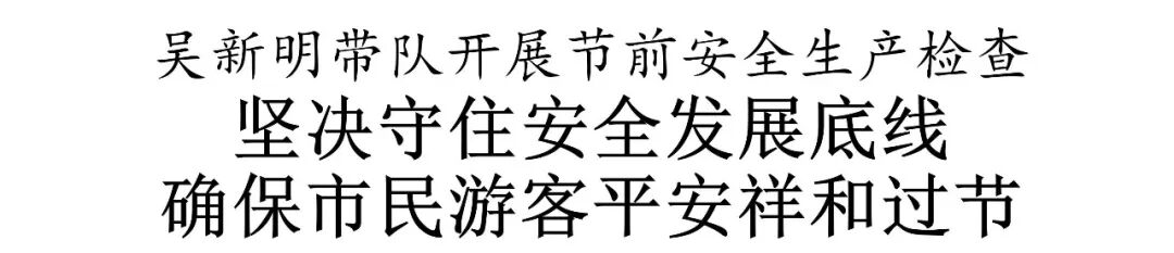 9月30日,市委书记吴新明带队深入企业、旅游景区、商业综合体等检查安全生产工作。他强调,要坚持人民至上、生命至上,压紧安全生产责任,抓实风险隐患排查整治,坚决守住安全发展底线,确保市民游客平安祥和过节。