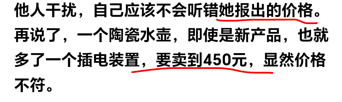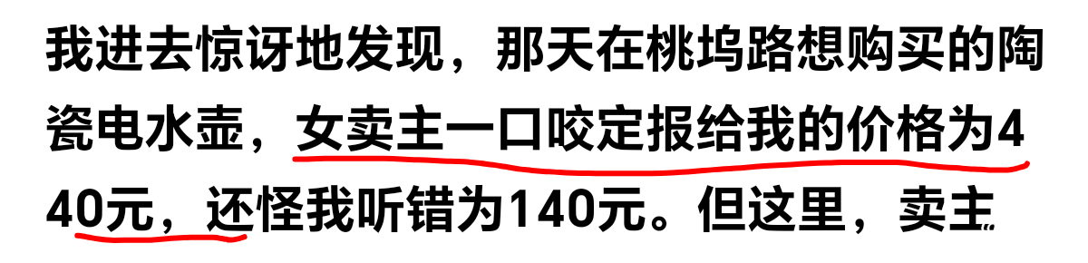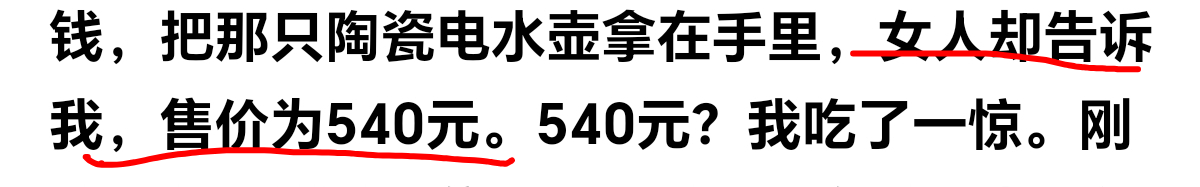 女人认为我听错了。还给我解释:这种陶瓷电水壶是新开发的产品,陶瓷选用的是上等的好料,不可能卖这种便宜价格。我暗自想,店铺里就我们两人,那个男人一直在外面。没有其他人干扰,自己应该不会听错她报出的价格。再说了,一个陶瓷水壶,即使是新产品,也就多了一个插电装置,要卖到540元,显然价格不符。