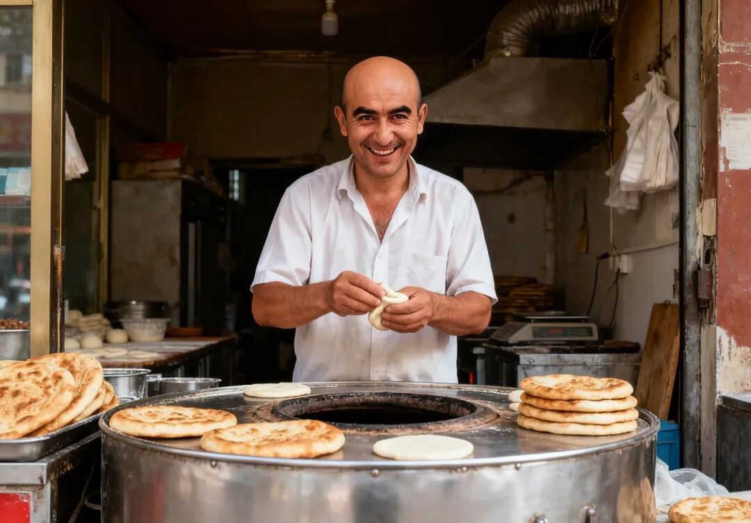 随着时间的推移,我和年轻人也从陌生变得熟悉。他姓岳,安徽阜阳人。因家里兄弟姊妹多,生活拮据,他十几岁时就跟着舅舅外出,学做大饼。那会儿,他个子还没有炉子高,站在炉前,跟着舅舅学和面、擀坯、贴炉壁,稍不留意就会擦到上百度的炉壁,烫到手臂,起水泡、留疤痕是常事。可他认准了这门手艺,再疼再苦也没退缩,硬是咬牙学艺。