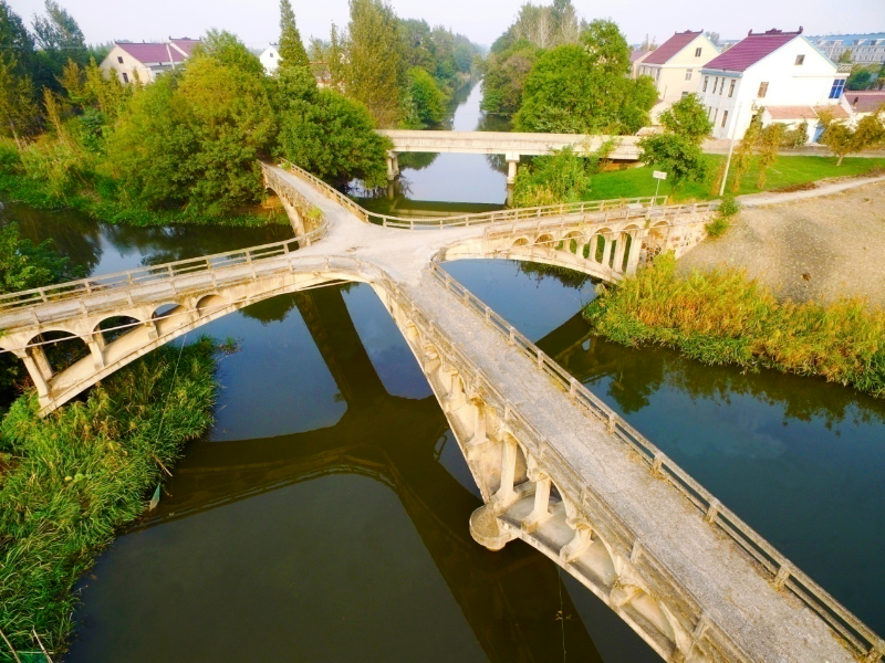 在我的心底,十字桥是一座快乐城堡。每每周末,父亲踩着脚踏车,载我穿越田间小道,前往十字桥。他垂钓,我玩耍。村里孩子很友善。我和他们在岸边赛跑,在桥洞捉迷藏。嬉闹一阵后,我气喘吁吁,汗珠滚滚,便跨过桥墩,避开阳光,爬入桥洞躺着小憩。我斜望左右,一边茂林修竹,青青竹竿,翠翠竹叶;一边良田万顷,星星点点的草屋,像金闪闪的麦穗缀入绿油油的田中。最迷人的画面,要数倒影。桥影入水,那单跨桥恰如仙鹤的长脖与瘦身,三跨桥又如仙鹤完全舒展的翅膀。河水因风皱起,桥影逐波灵动,又仿佛巨型八爪鱼摇曳的触角。风渐渐大了,穿洞飞过。我闭目听风,幻想着自己坐在十字桥心,仿佛骑着那只仙鹤翱翔云端。
