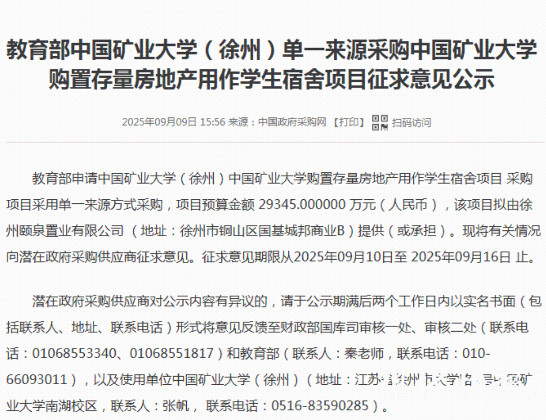 近日,中国矿业大学南湖校区拟用2.9345亿元,收购周边存量房解决学生宿舍不足。 据悉,因为校内没有可开发的土地,学校周边几公里范围内也没有合适的土地出让,短期内达不到自建的条件,中国矿业大学拟通过单一来源采购的形式,购置隐山观湖·观山府C2组团房产项目14栋490套现房用作学生宿舍,套均价格60万元,相当于开盘价打了5折。 招标项目公示 官网截图 中国矿业大学通过单一来源购置存量房地产用作学生宿舍的消息于2025年9月9日公示征求意见。公开的资料称,中国矿业大学根据学校《“十四五”校园基本建设规划》和《南湖校区总体规划建设方案》中确定的办学规模结合《普通高等学校建筑面积指标》测算,学校学生宿舍面积缺口137634平方米。随着国家对高校招生政策扩招的要求,学生宿舍缺口将快速增大。目前,校内没有可以开发的土地,学校周边几公里范围内也没有合适的土地可出让,短期内达不到自建的条件。 隐山观湖·观山府C2组团项目 东南大学教授李德智给此项目的论证意见称,中国矿业大学购置隐山观湖·观山府C2组团房产项目是成本效益最优解。项目总建筑面积45788.52平方米,已通过竣工验收,尚有14栋楼未出售,房源490套,楼宇相对集中,室内环境良好,房屋数量、房型面积均符合改造成学生宿舍的条件要求。改造投入可控,与学校的需求高度匹配。购置现房总成本低于自建模式(含土地、规划、建设等环节),可实现“即购即用”,能快速解决学校问题,且该项目已经获上级主管部门的批准实施。因此隐山观湖·观山府项目在政策适配性、地理唯一性、成本效益上均无替代选项,能直接匹配中国矿业大学紧迫的宿舍资源需求。 江苏师范大学教授李因果也认为,观山府C2组团距离南湖校区6.5公里,是唯一满足“楼宇集中、房源充足(490套)的现房项目,其空间集中度和通勤效率无可替代,便于对学生宿舍进行集中统一管理。 据悉,隐山观湖位于徐州市铜山区,共有6个组团,是一个百万方大盘,距离中国矿业大学南湖校区大概7公里。其中,观山府C2组团共21栋楼,主要打造多层、小高层、高层住宅产品,户型建筑面积约96—145㎡,于2024年12月31日全部完成竣工验收备案。目前,1-4号楼已经有部分居民装修入住。 根据公开信息,该小区首次开盘套均价格在120万元以上,而中国矿业大学徐州南湖校区拟购置的这批房产套均价不到60万元,相当于打了5折。 在国内,中国矿业大学不是第一家通过购买存量房地产解决学生宿舍不足问题的高校。根据中国政府采购网的公开信息,今年9月份以来,中南大学拟出资2.9538亿元,购置存量房地产用作学生宿舍项目;合肥工业大学拟出资1.176亿元,通过单一来源采购的形式,购买存量房,补充宿舍资源。 有关专家表示,面对学校宿舍紧张的局面,通过购买、租赁学校周边存量社会用房,补充宿舍资源,不仅可以消化房地产库存,也为部分高校未来解决住宿问题提供了一个方向。徐州市规划设计院正高规划师李玲认为,中国矿业大学通过以购代建,优化高等教育资源配置,是一种创新实践。 南通0 |