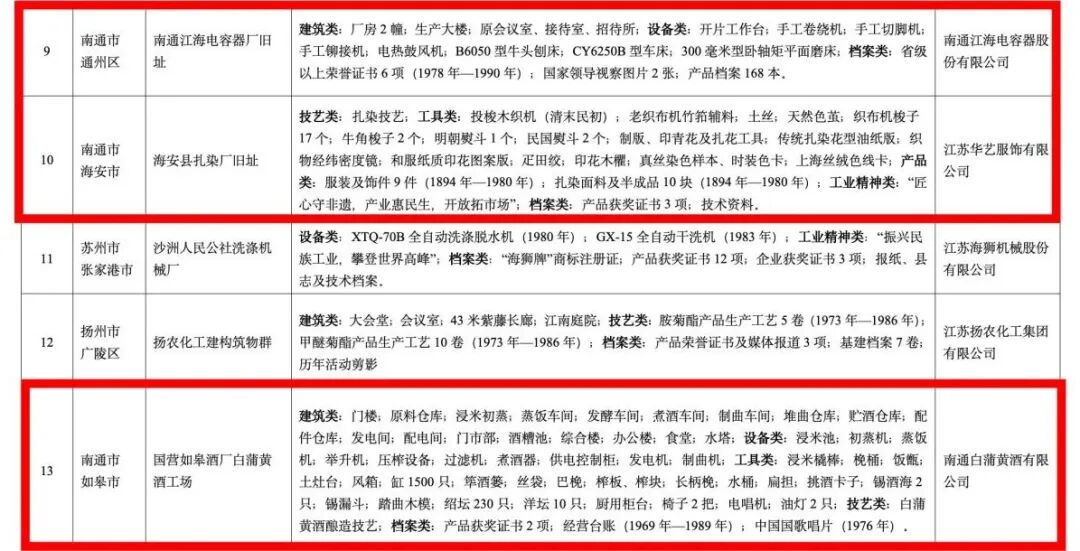 11月25日 省工业和信息化厅发布的 《第三批江苏省工业遗产拟公布名单》 公示结束 此次全省共13个项目入选 我市江海电容器、华艺服饰、白蒲黄酒 三个项目位列其中 入选数量并列全省第一