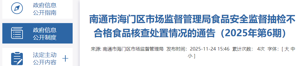 依据《中华人民共和国食品安全法》《中华人民共和国食品安全法实施条例》《中华人民共和国行政处罚法》等法律法规,根据南通市海门区市场监督管理局关于公布2025年食品安全监督检查、抽检信息的公告,现将核查处置情况通报如下: