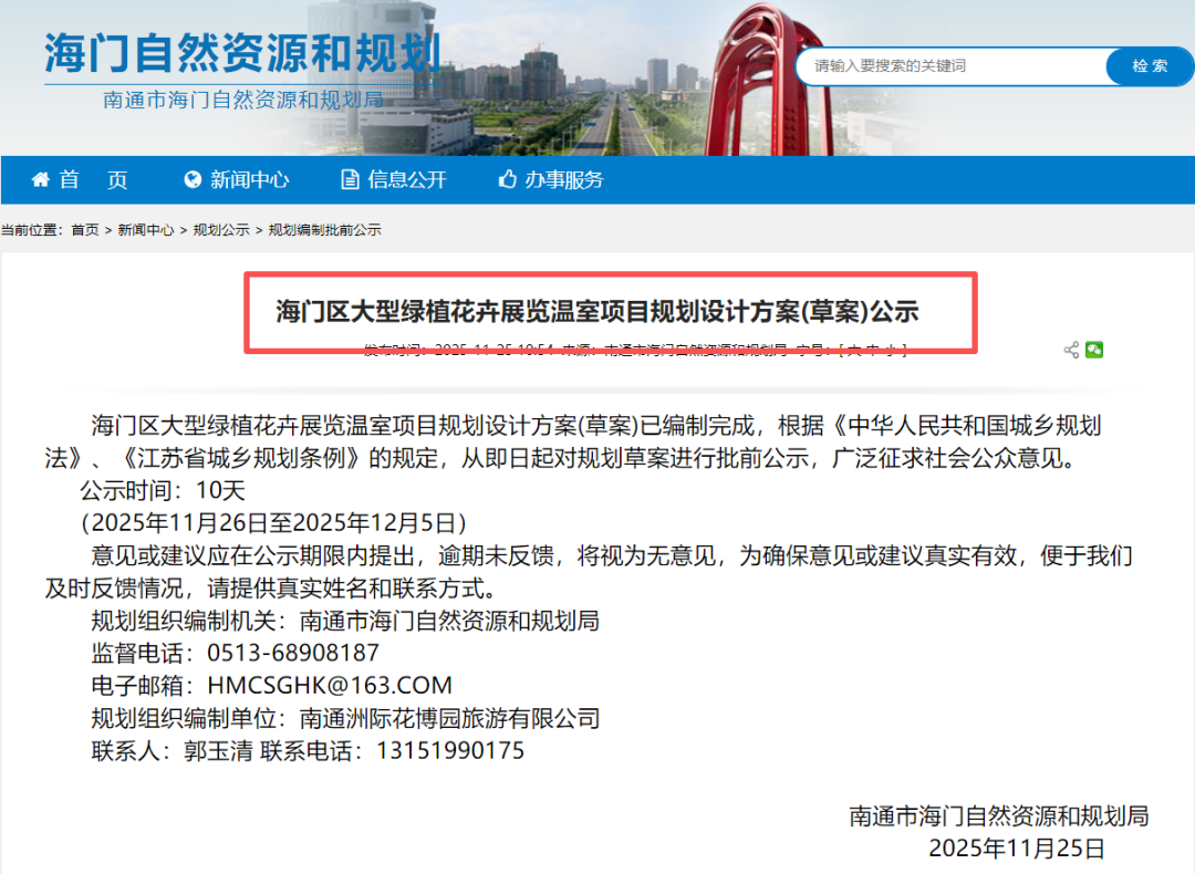日前,南通市海门自然资源和规划局发布了《海门区大型绿植花卉展览温室项目规划设计方案(草案)公示》。根据此前无线海门发布的消息,该项目即海门洲际花博园项目(二期)。
